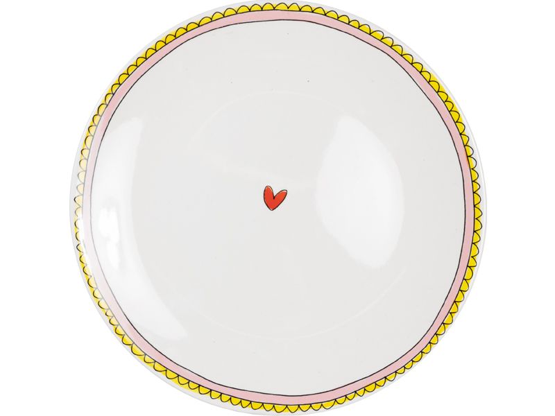 Dit Even Bijkletsen dinerbord (26 cm) heeft een zachte roze rand, een fijn geel patroontje en middenin een klein rood hartje. Niet schreeuwerig, wel helemaal Blond. Groot genoeg voor ontbijt, lunch of een flinke stapel pannenkoeken. Combineert moeiteloos met de rest van je Blond Amsterdam servies, maar steelt ook solo de show. Voor wie houdt van een bord met een knipoog en een beetje liefde. Want ook de simpelste maaltijd verdient een mooi bord. Ontdek meer borden uit de Even Bijkletsen-collectie.