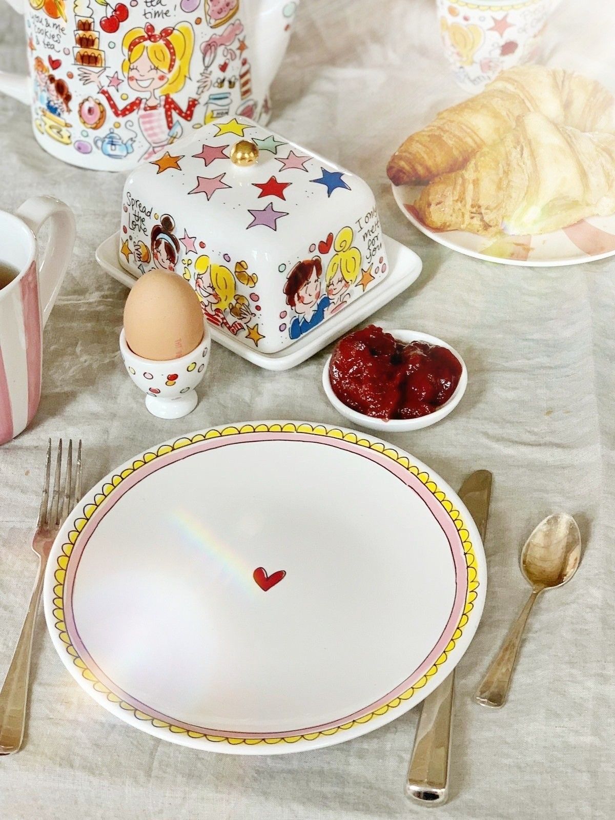 De collectie Even Bijkletsen is nog steeds de grote favoriet van vele Blond-liefhebbers. Daarom hebben we deze lijn vernieuwd met 12 superleuke items. De nieuwe items zijn leuk om met elkaar te combineren, maar passen ook heel goed bij onze huidige Even Bijkletsen items. Dit ontbijtbord heeft een sierlijke geel met roze rand en er staat een rood hartje afgebeeld in het midden. Heerlijk om 's ochtends op te ontbijten!