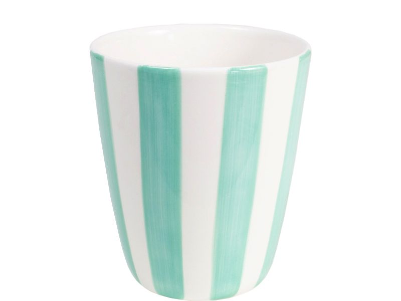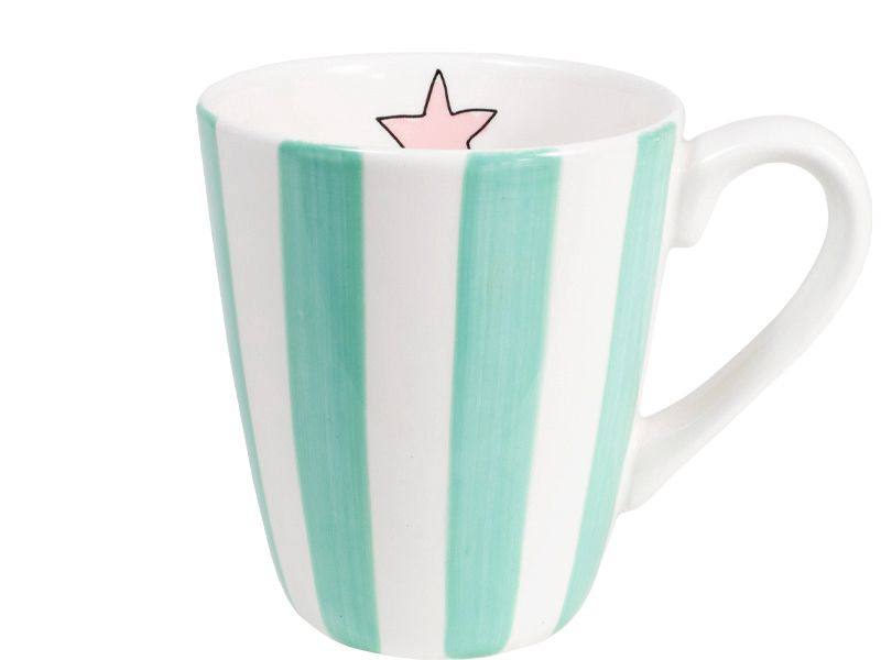 De collectie Even Bijkletsen is uitgebreid met nieuwe items. Dit keer niet met de kenmerkende illustraties, maar met kleurrijke strepen. Dit servies is leuk te combineren met het reguliere Even Bijkletsen servies of juist ook leuk om te combineren met onze andere collecties. Deze beker bestaat uit een licht groene (mint) streep met wit. Aan de binnenkant van deze beker staat een ster afgebeeld. Deze beker kan je leuk combineren met de andere nieuwe producten met sterren en of strepen of je kan het leuk combineren met het reguliere servies van Blond Amsterdam.