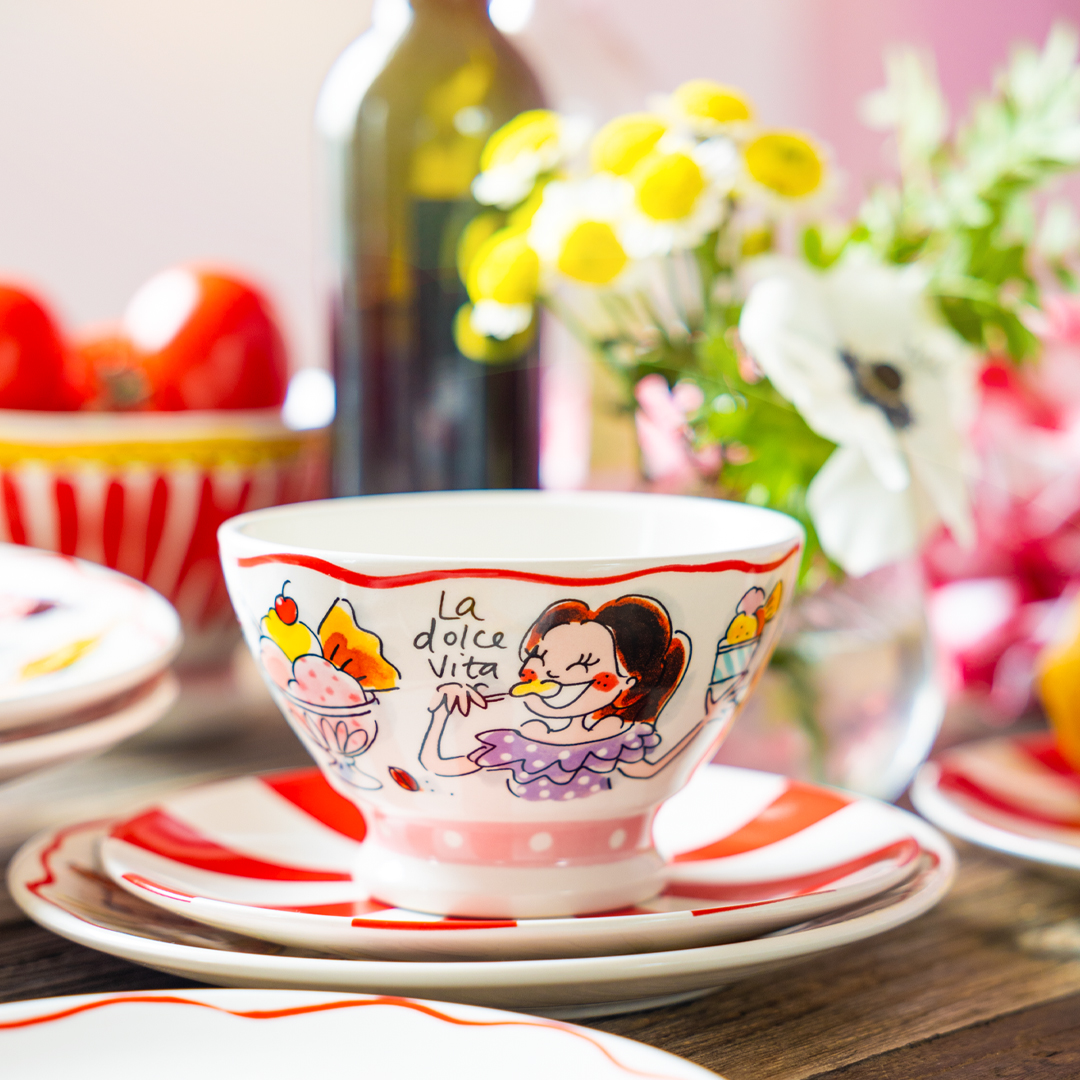 Breng een vleugje Italiaanse charme aan je tafel met de "La Dolce Vita" kom van Blond Amsterdam. Deze stijlvolle kom, onderdeel van de nieuwe pasta collectie, is perfect voor het serveren van ijs, desserts of andere lekkernijen. Versierd met vrolijke Italiaanse illustraties en de tekst "La Dolce Vita," straalt deze kom de kenmerkende, speelse stijl van Blond Amsterdam uit. De kom op voet is ideaal voor zowel dagelijks gebruik als speciale gelegenheden. Het stevige ontwerp zorgt ervoor dat je deze kom keer op keer kunt gebruiken. Voeg wat Italiaanse flair toe aan je servies en ontdek meer kleurrijke items uit de Blond Amsterdam collectie.