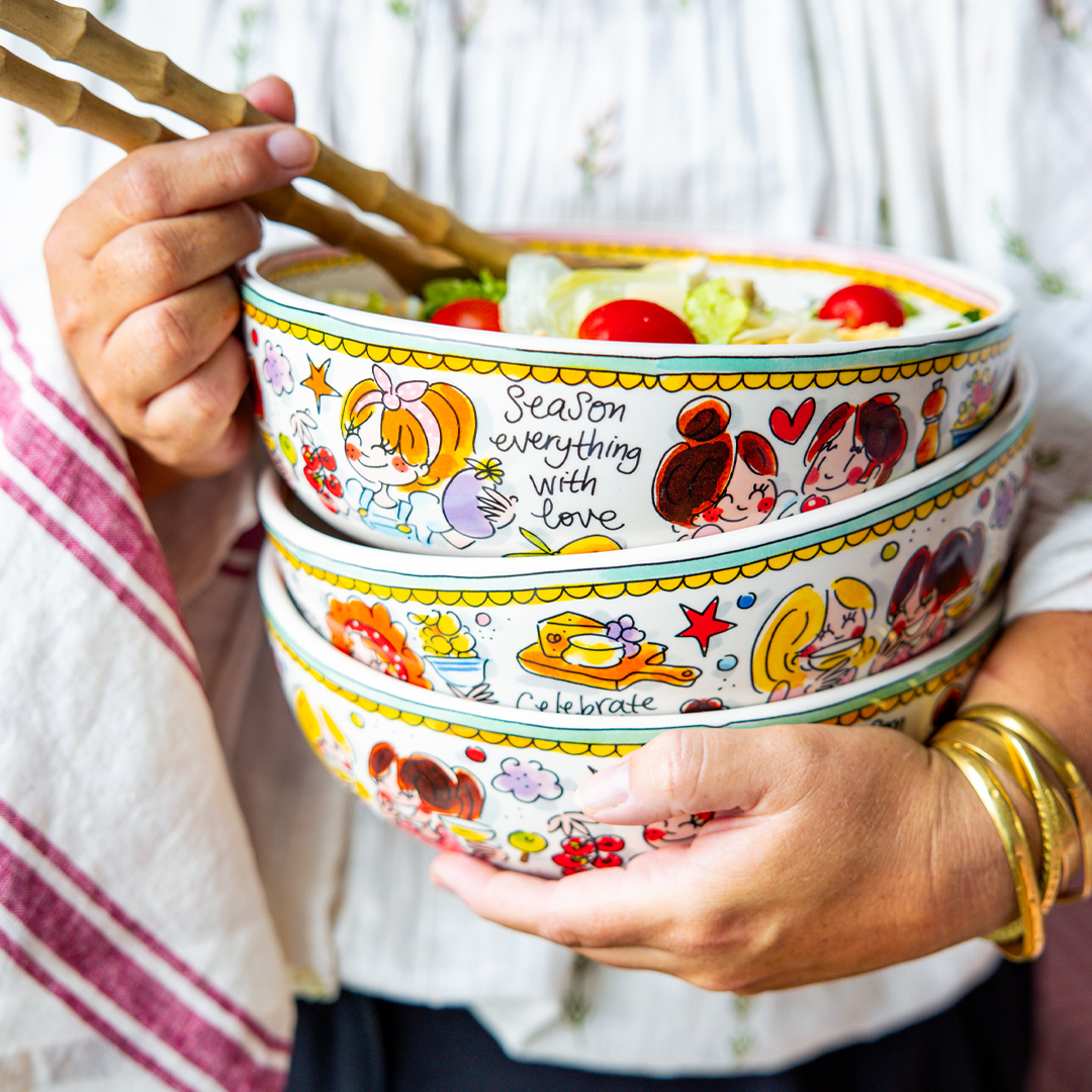 Maak je klaar voor een kleurrijke salade én een goed gesprek met de splinternieuwe Even Bijkletsen Saladeschaal van 24 cm. Of je nu een groene salade maakt, een pastasalade of een mix van alles wat je lekker vindt, deze schaal uit de Blond Amsterdam Even Bijkletsen collectie is precies wat je nodig hebt. Groot genoeg voor die extra portie gezelligheid en vol vrolijke illustraties die een lach op elk gezicht toveren. Deze schaal schreeuwt: “Vul me met iets lekkers en zet me midden op tafel!” Hij is diep genoeg voor je favoriete salade en vrolijk genoeg om elk etentje net wat gezelliger te maken. Of je nu kletst met vrienden, familie of jezelf (we oordelen niet), deze schaal zorgt ervoor dat je altijd stijlvol kunt genieten. Een perfecte aanwinst voor je keuken of als cadeau voor die vriendin die altijd iets te vertellen heeft. En psst... hij is ook handig voor chips of pasta!
