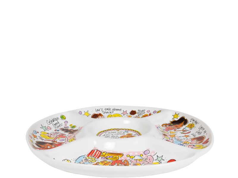 Celebrate good times! Onze nieuwe Even Bijkletsen snackschaal heeft 5 vakjes. Voor iedere gelegenheid leg je steeds iets anders in de schaal. Combineer stukjes komkommer of paprika met chips of nootjes. Op de schaal staan vrolijke tekeningen in Blond stijl en grappige teksten, zoals ‘Let’s talk about snacks’ en ‘Calories don’t count on the weekend’. Ontdek meer inspirerende items uit de Blond Amsterdam collectie of in onze Blond sale en breng wat Amsterdamse gezelligheid in huis!